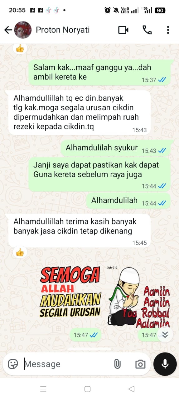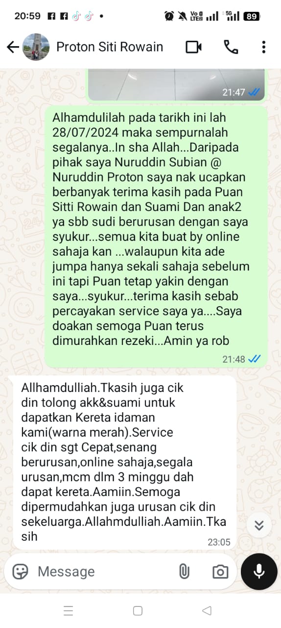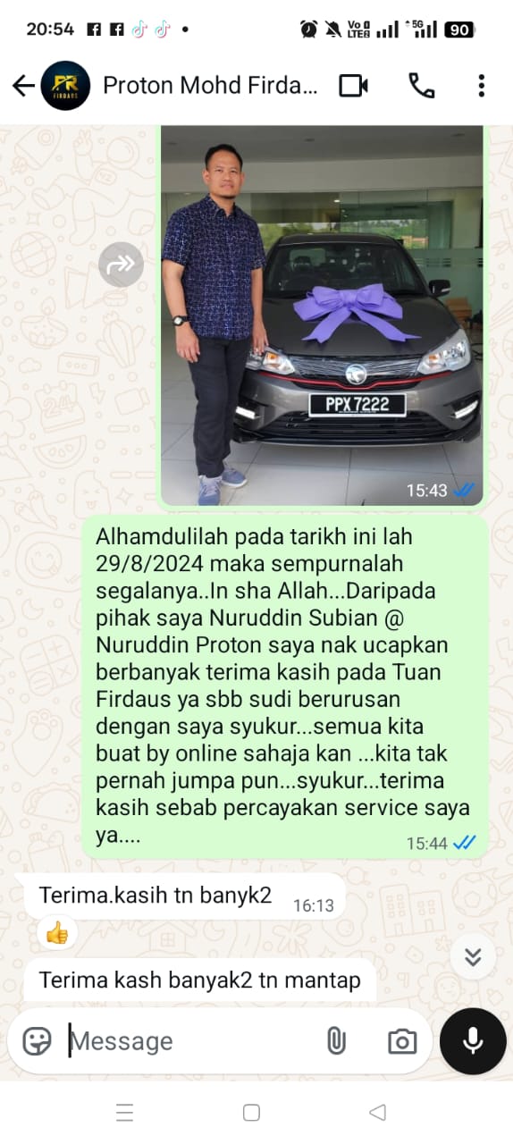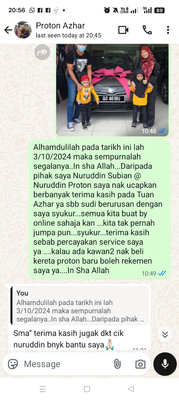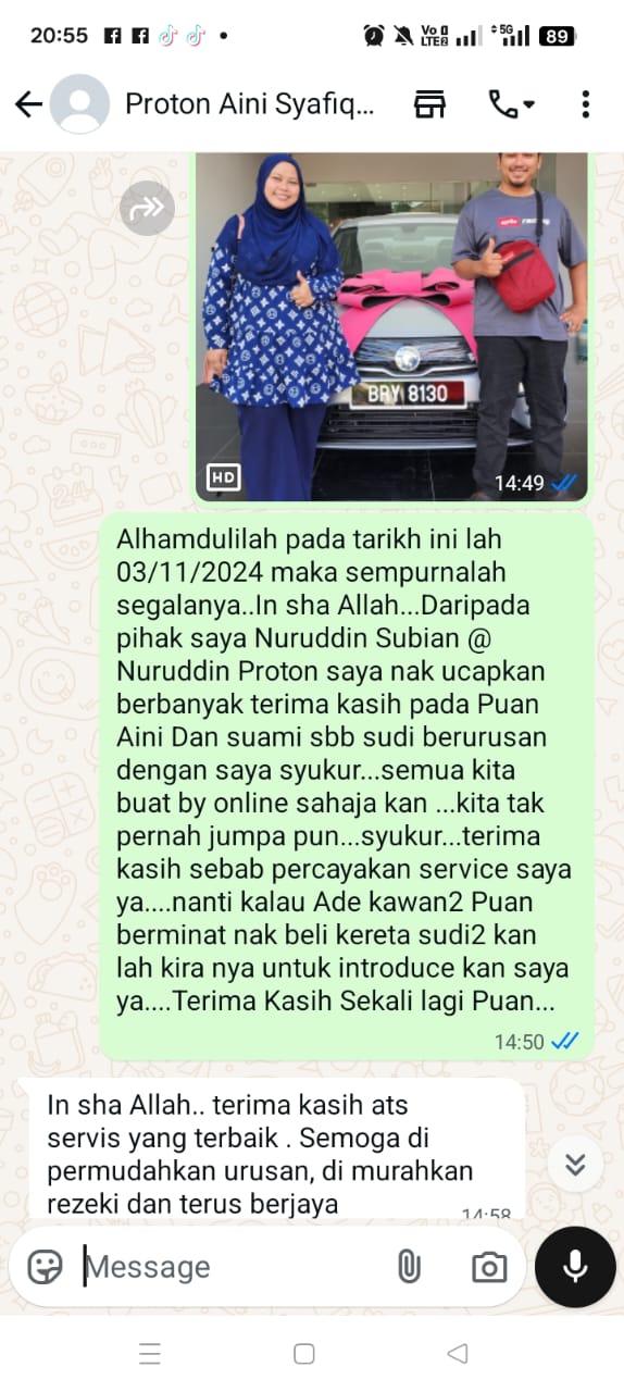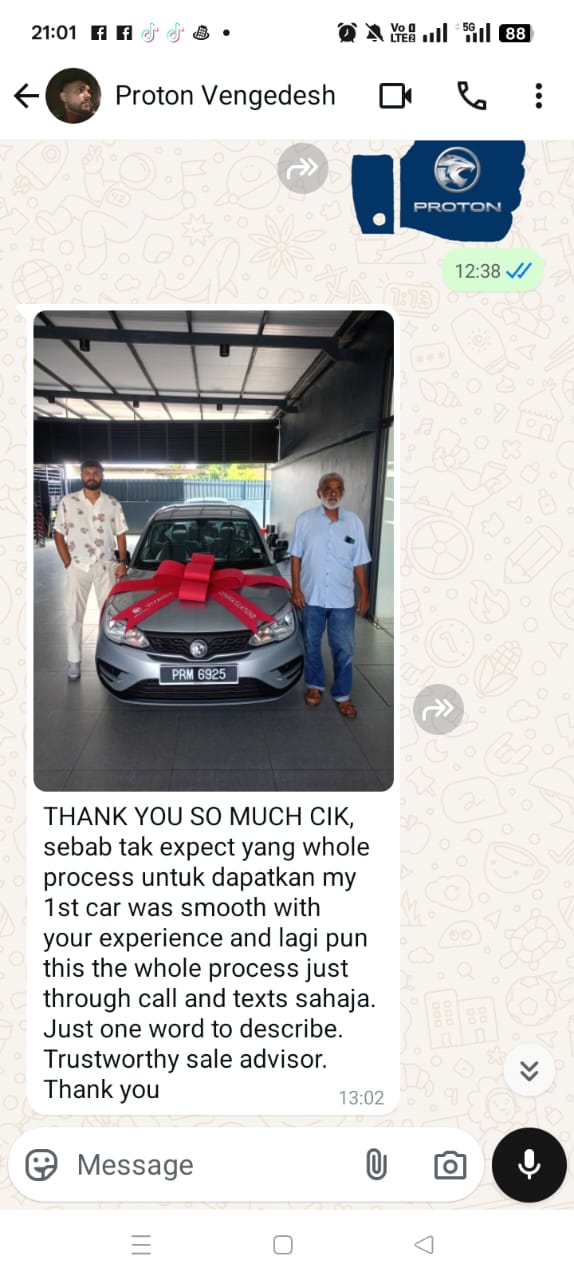 Saya telah berjaya membantu ribuan pelanggan untuk memiliki kereta Proton baharu. Seluruh proses pemilihan, pinjaman dan penghantaran kereta akan dibantu sepenuhnya oleh saya!